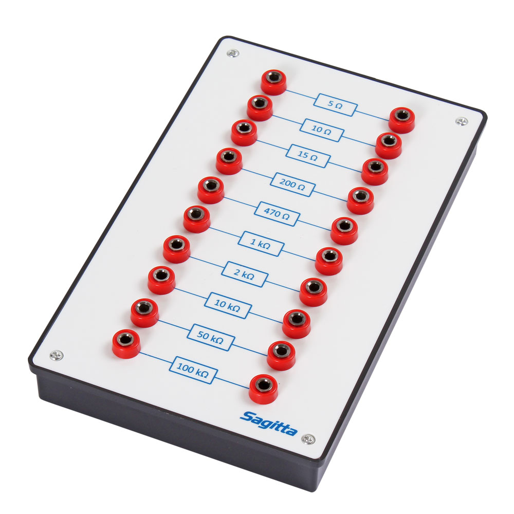 Motstander: 5 Ω, 10 Ω, 15 Ω, 200 Ω, 470 Ω, 1 kΩ, 2 kΩ, 10 kΩ, 50 kΩ og 100 kΩ.